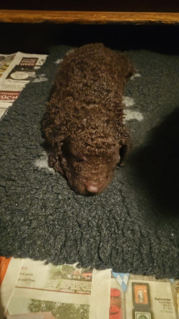 Nach so vielen neuen Eindrücken, Spielen, Schnuppern und Kuscheln wird es langsam still in der kleinen Curly-Welt.